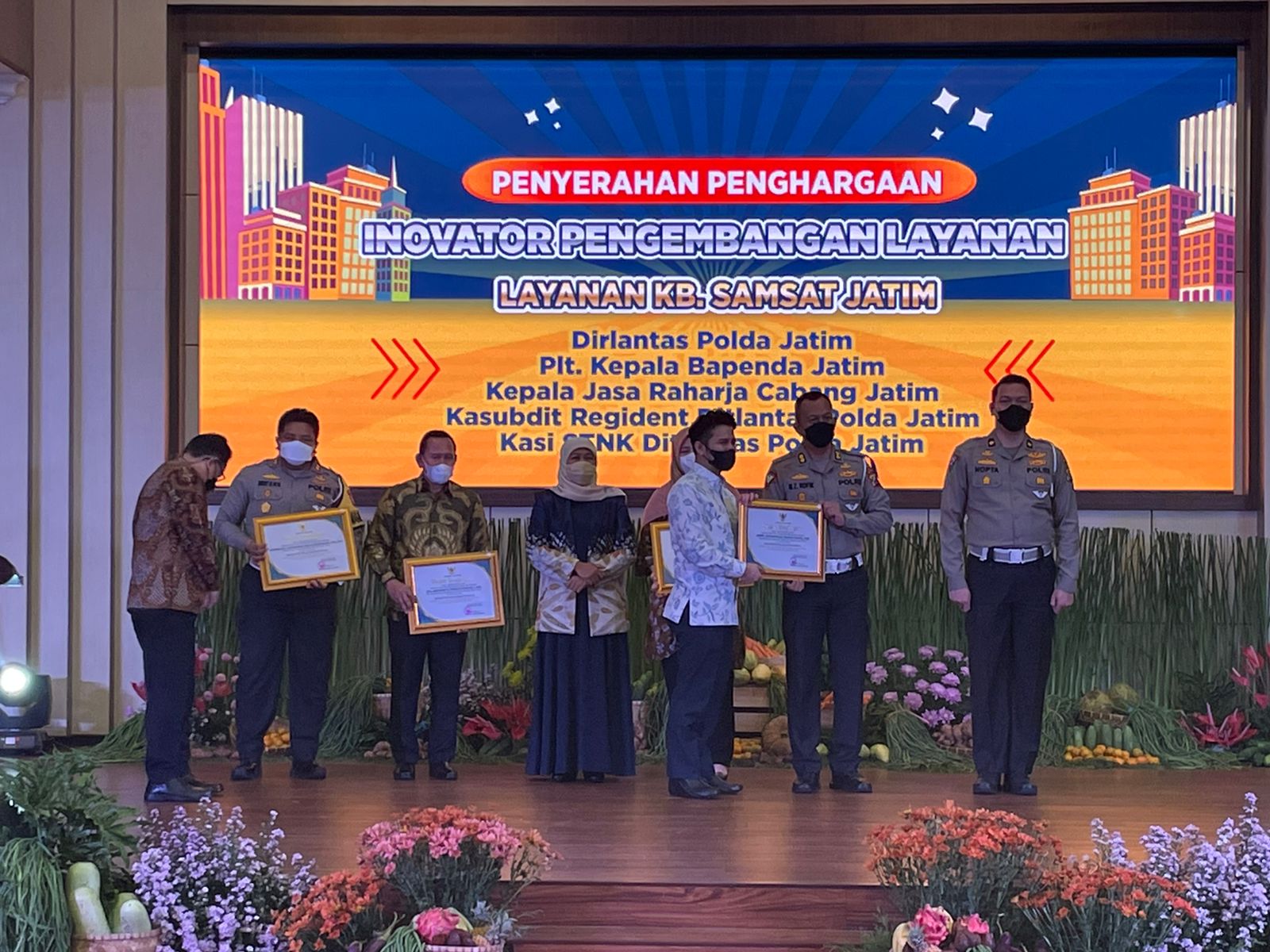 Serta dilaksanakan juga pemberian penghargaan untuk tim pembina dari Ditlantas Polda Jatim, Jasa raharja, bapenda atas inovasi dan pengembangan pelayanan kantor bersama Samsat Jatim sebagai pendukung kebijakan Gubernur.